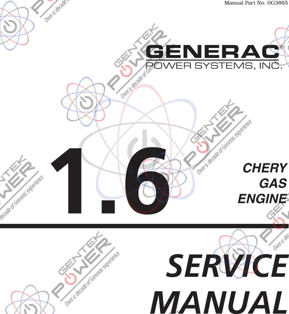 Generac 1.6L Chery Engine Service & Repair Manual. 76 page manual covers the 1.6L Chery engine commonly found in the older 20kW, 25kW, and 30kW 3600 RPM units. This is for the 1.6L engines only, and covers NO electrical testing or diagnostics for the generators as a whole.